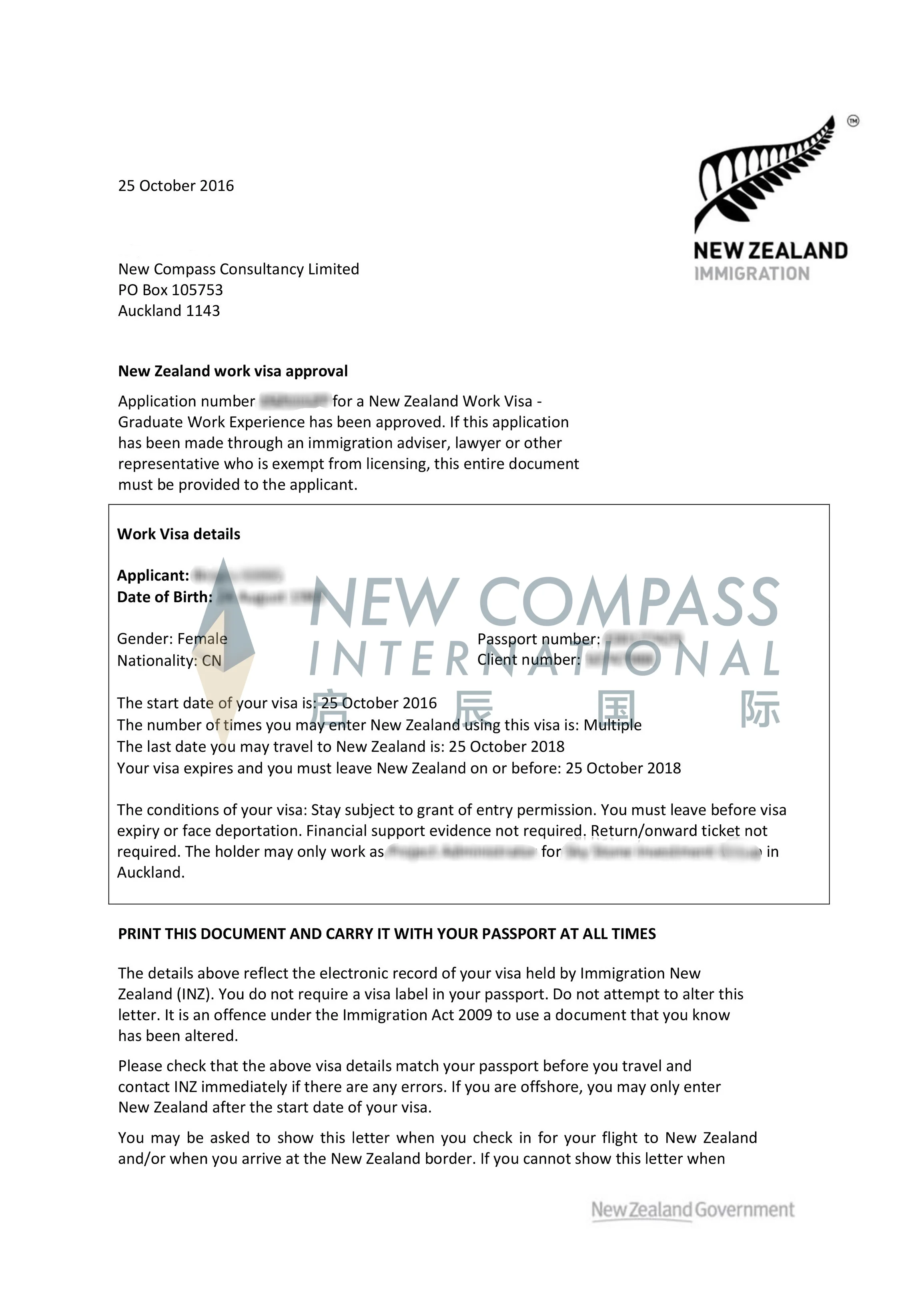 我司成功帮助越南籍申请人办理新西兰居留签证。
