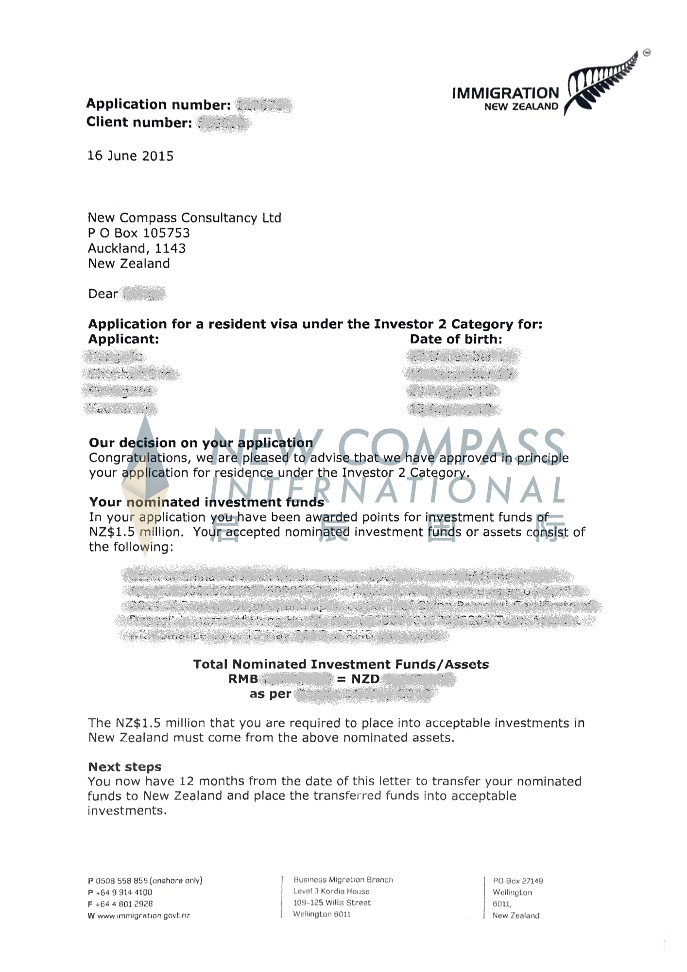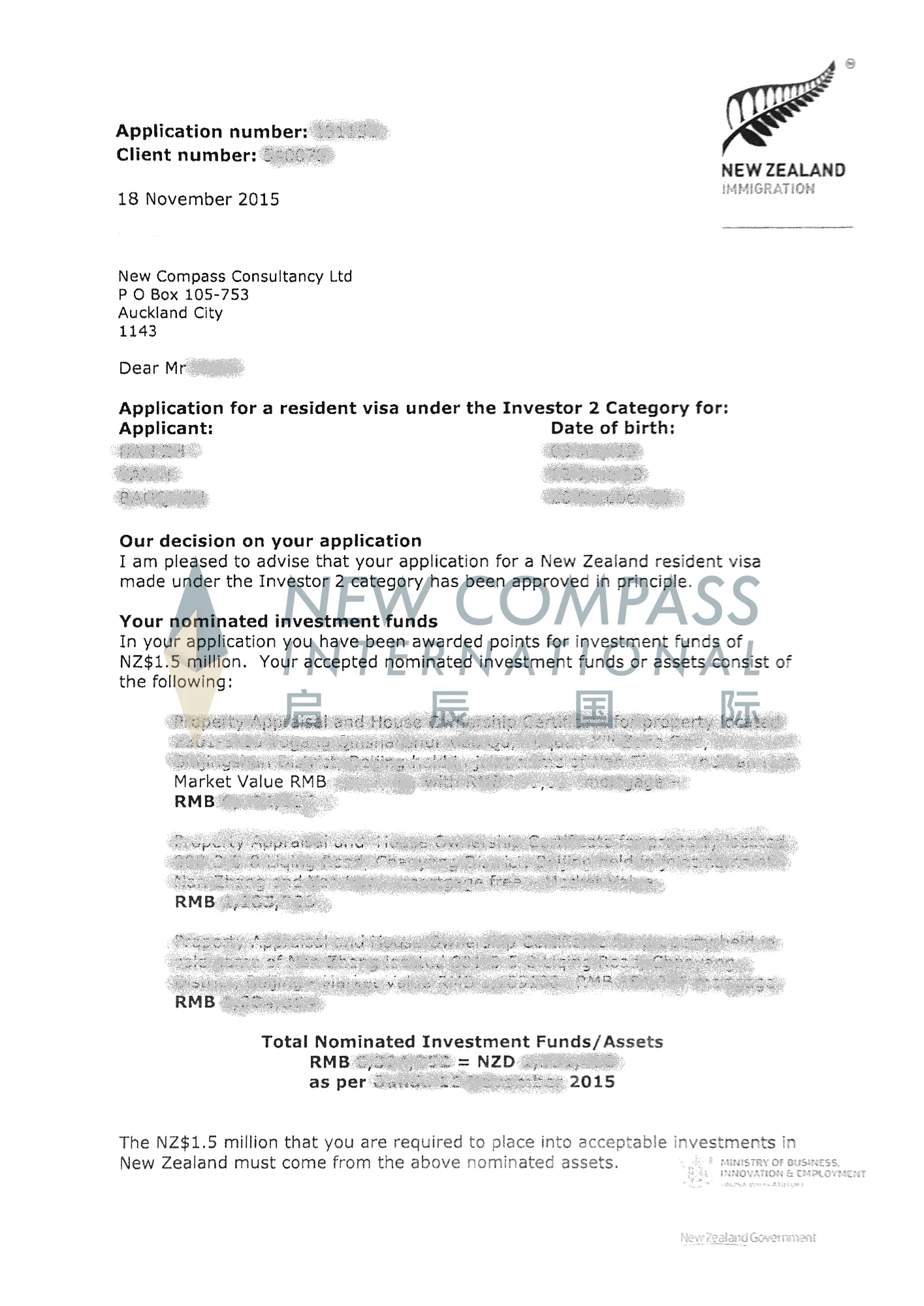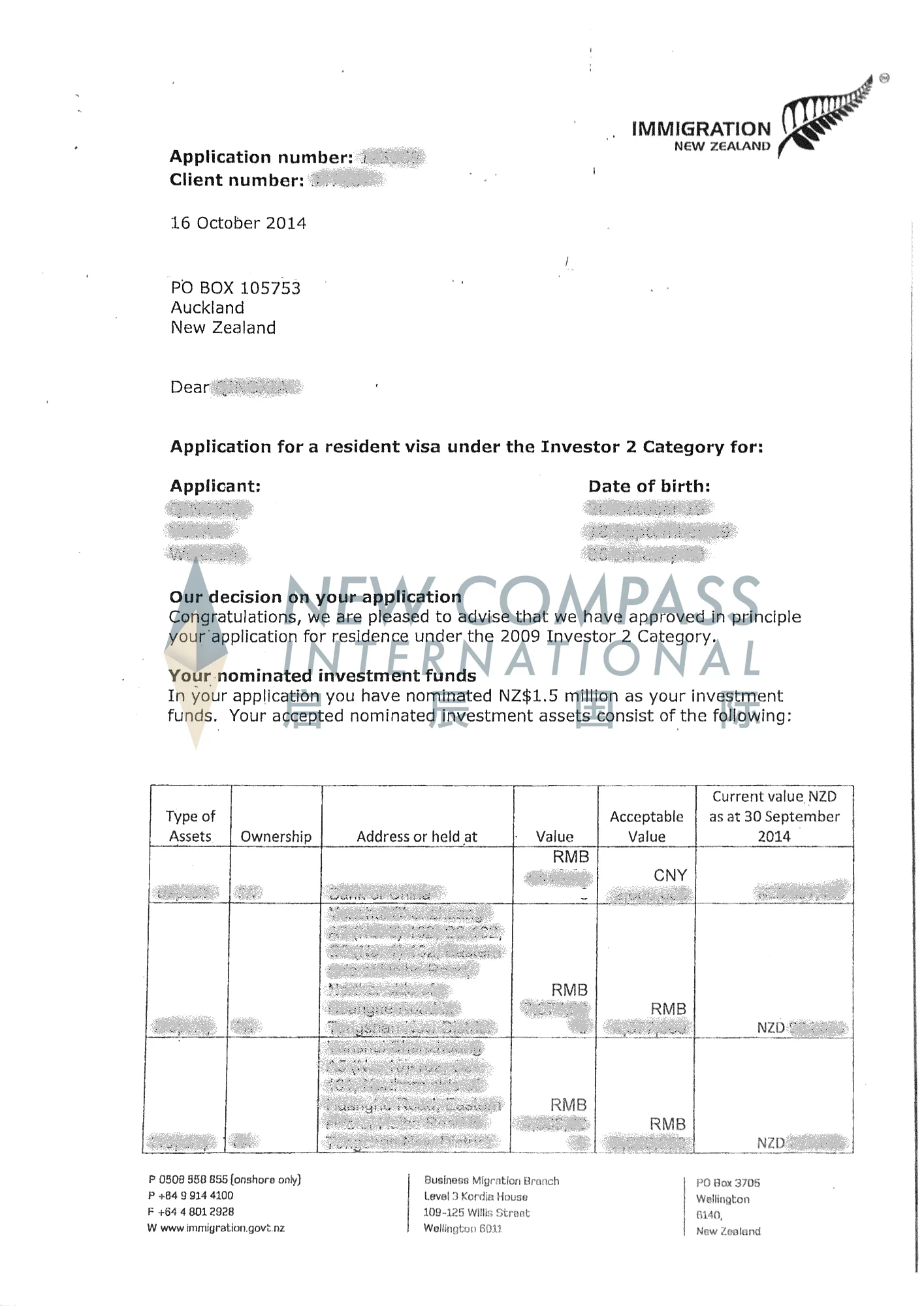 我司成功办理国内新西兰投资移民申请,办理一步到位,未曾收到新西兰移民局质疑信。