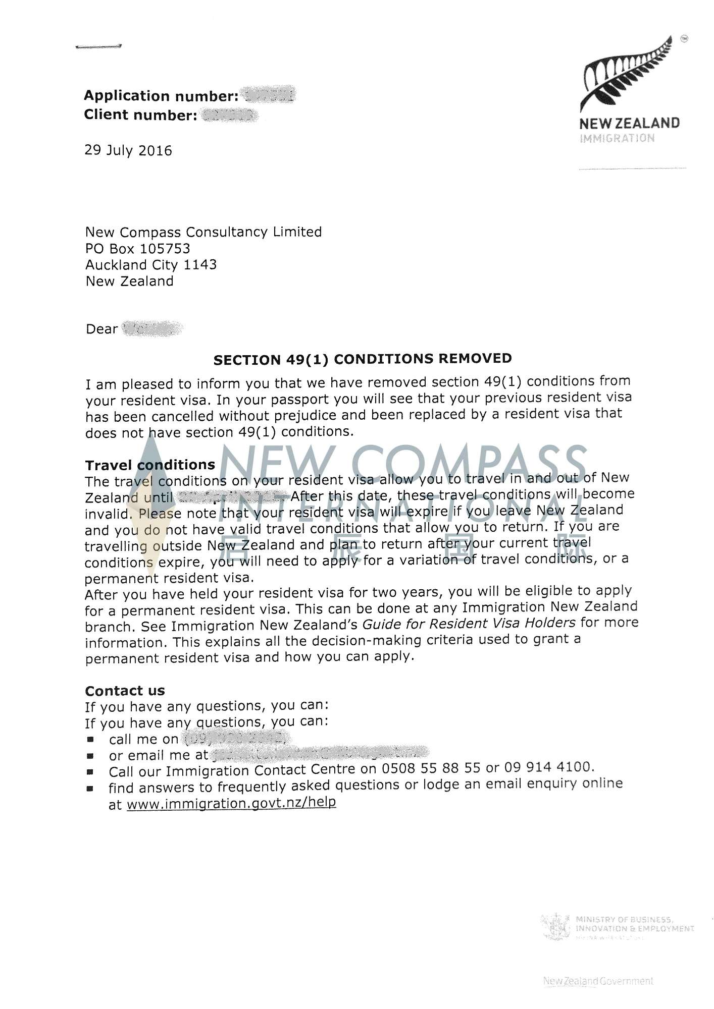 我司协助申请人取消Section 49限制性条款,申请人顺利获得新西兰无条件居留签证。