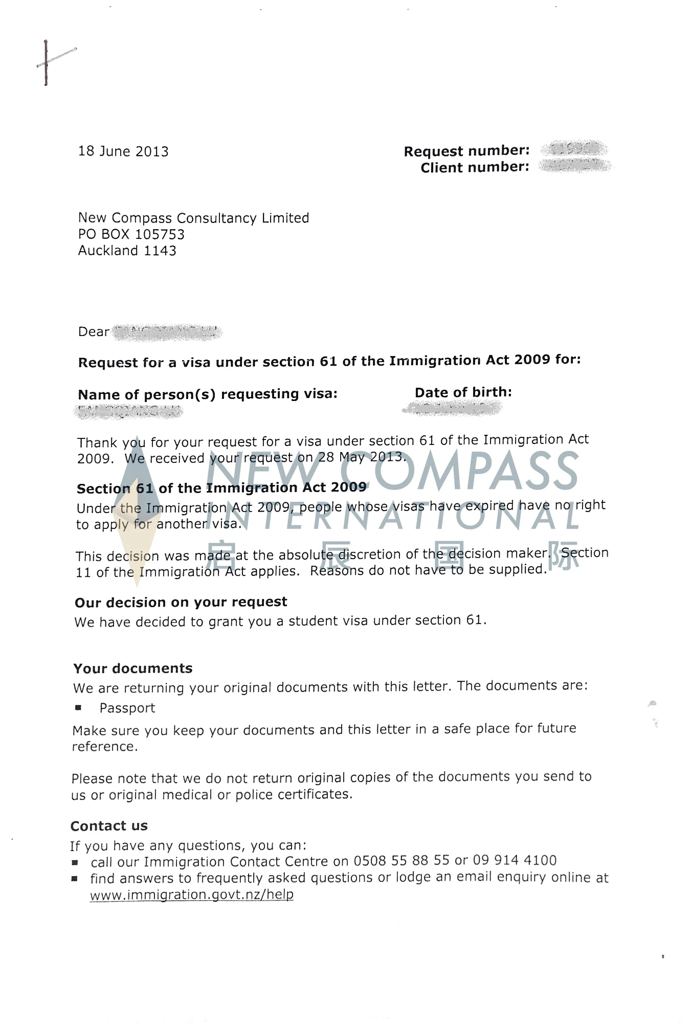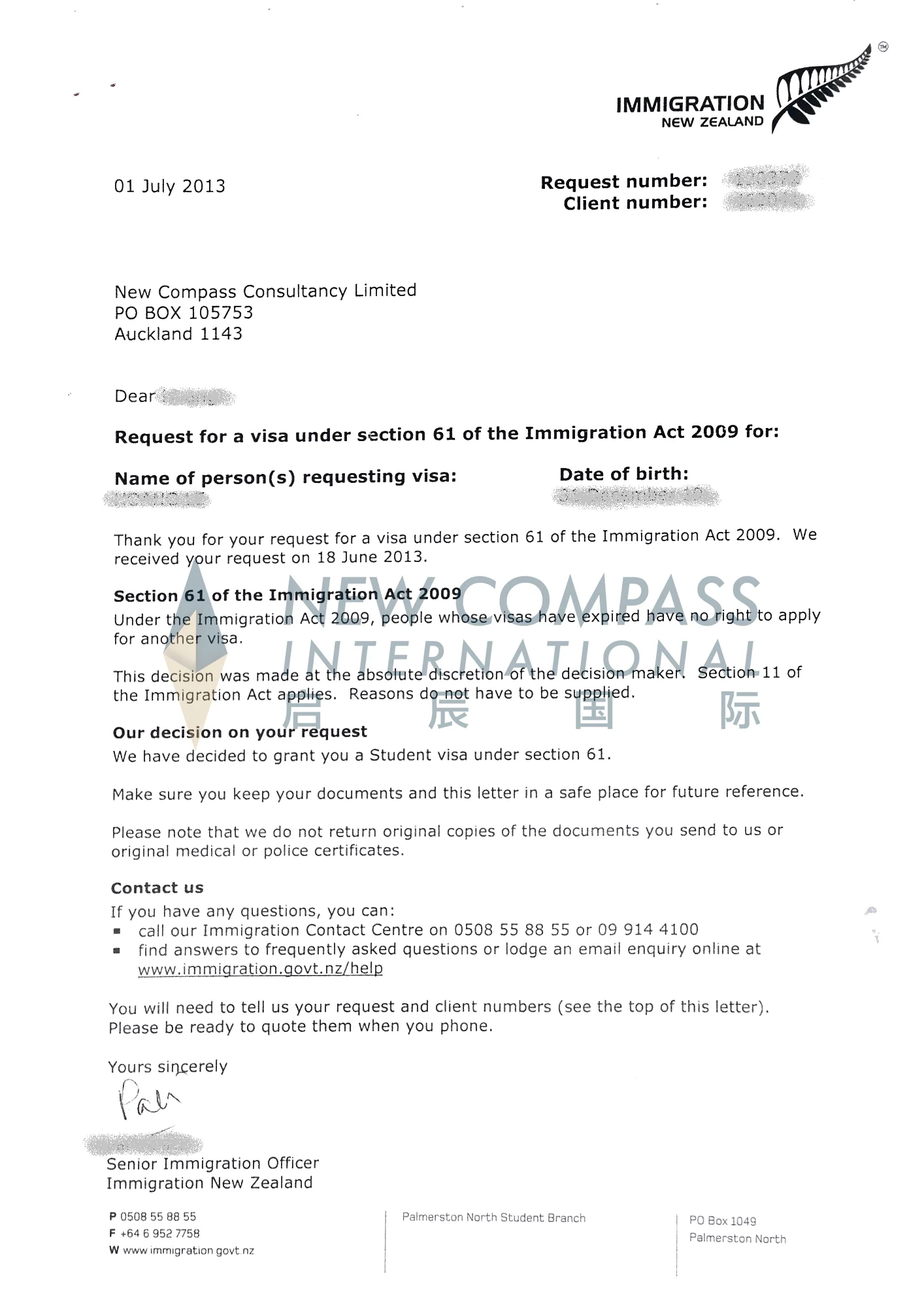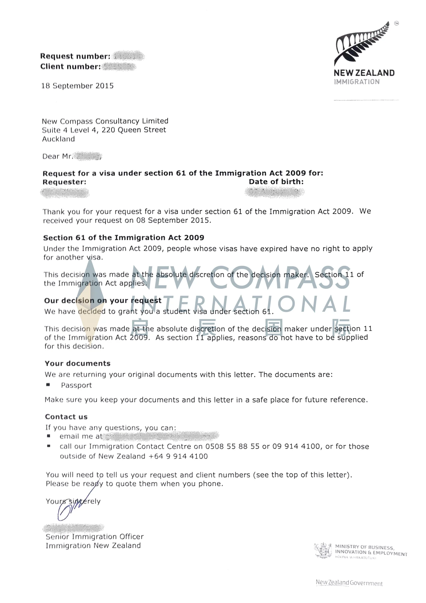 我司成功为新西兰签证过期人士办理新西兰签证申请(Section 61)。